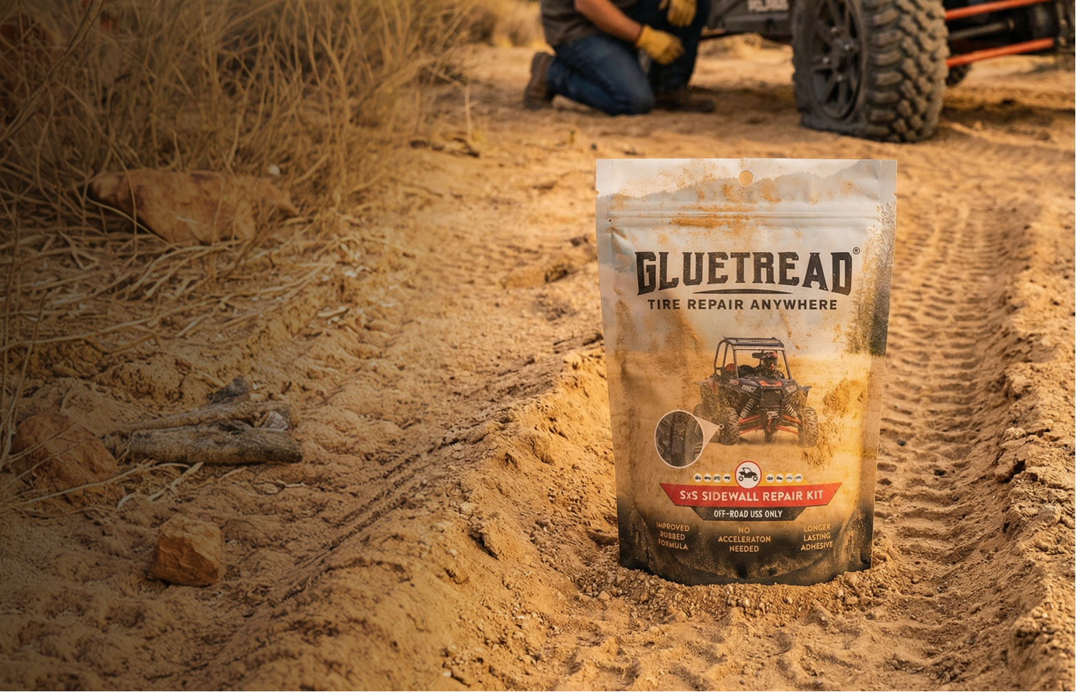The GlueTread SxS Sidewall Repair Kit is an industry-tested, American-made solution designed specifically to repair sidewall damage in off-road environments. While most repair kits only address tread punctures, this system was engineered to solve one of the most common trip-ending failures: cuts and tears in the sidewall.