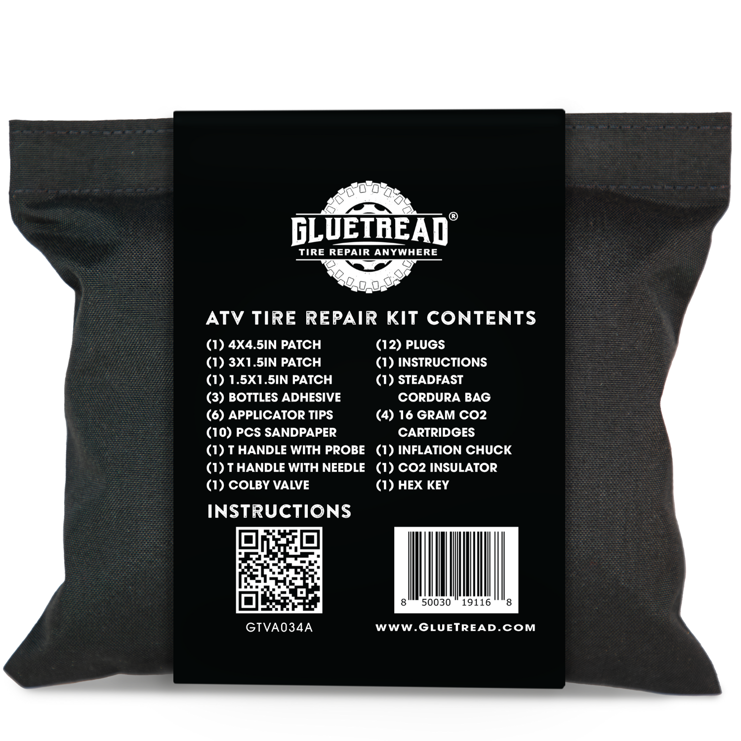The GlueTread ATV Pro Kit, originally designed for the US Border Patrol, is your all-in-one trail repair solution. Handle sidewall tears, valve stem damage, and punctures effortlessly with everything you need—including CO2 cartridges for quick reinflation. With CNC-machined aluminum T-handles and a rugged Cordura bag, both crafted in Montana, this kit is built to last.
