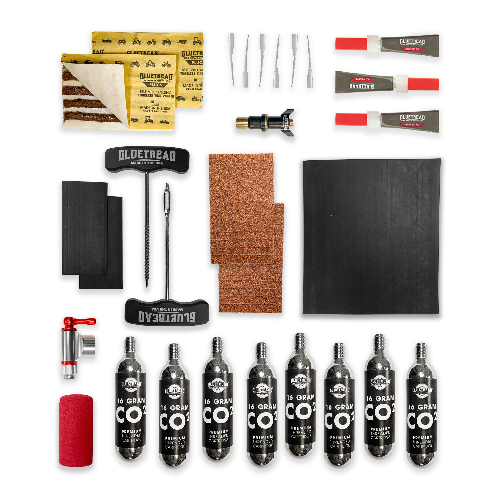 The GlueTread SxS Pro Kit is the ultimate universal spare tire solution for Side by Sides. Whether you need to repair a sidewall, replace a valve stem, or fix a puncture, this kit has you covered on the trail. Plus, it includes CO2 cartridges for quick and easy inflation without the need for an air compressor.